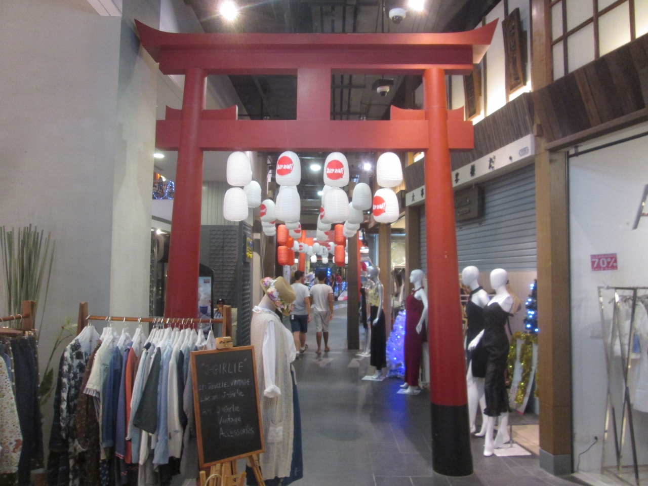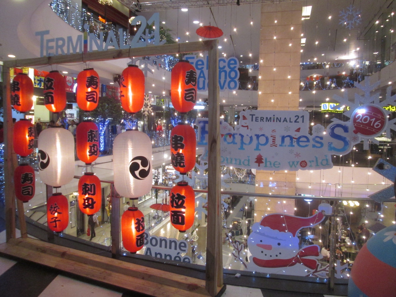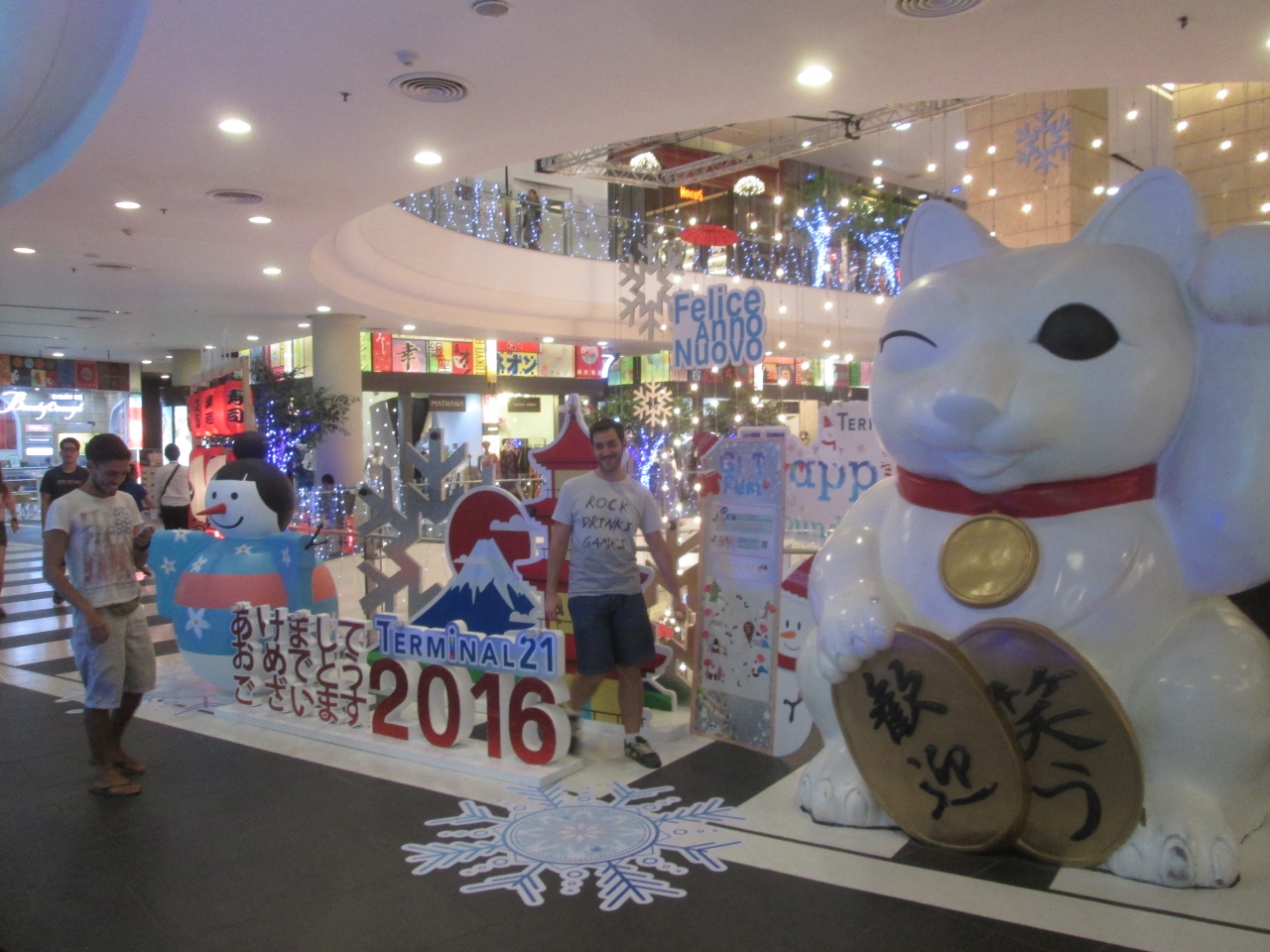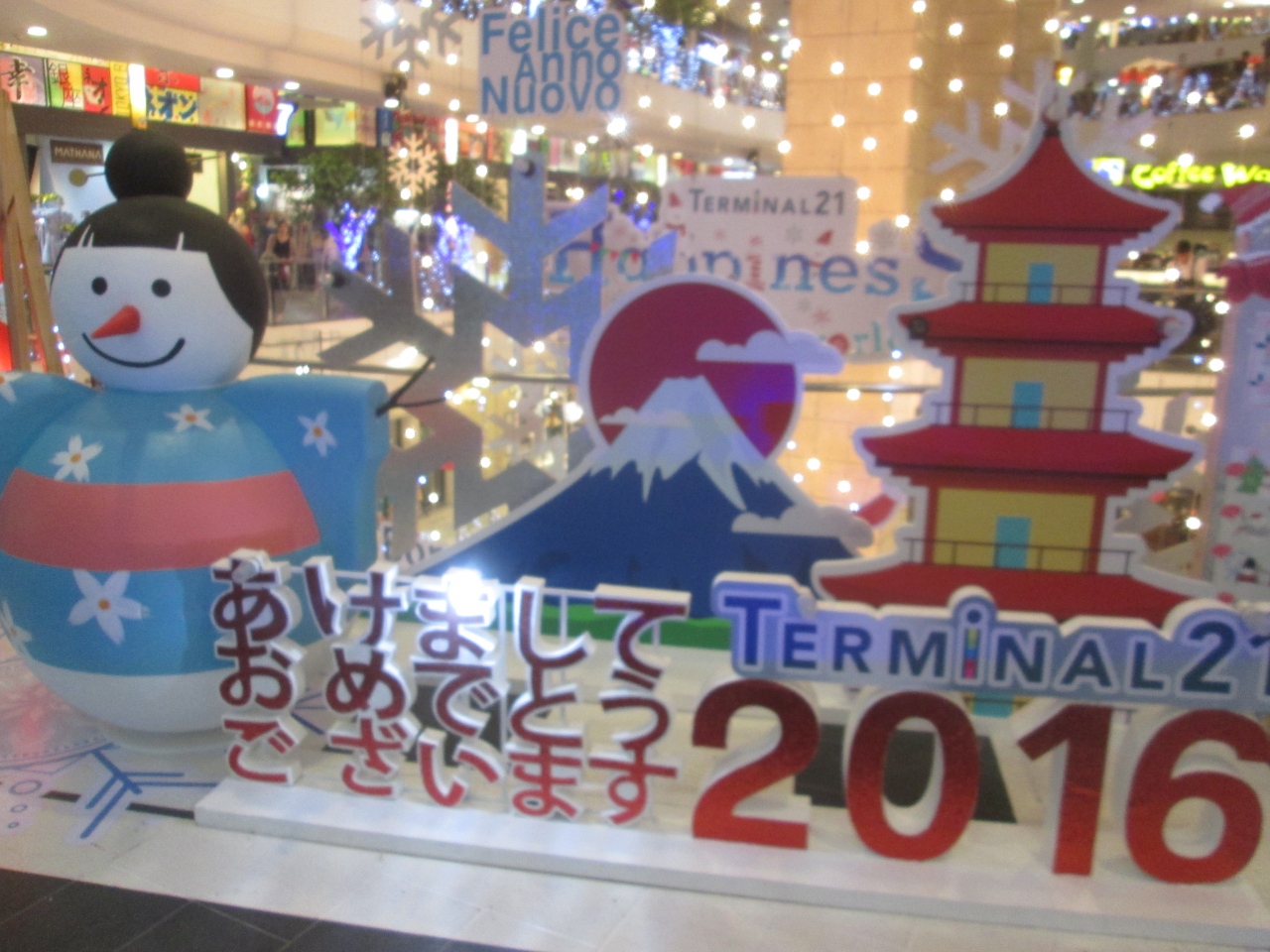 クリスマスが過ぎてターミナル21の店内では新年のお祝いモードになりました。「あけましておめでとうございます」の日本語の文字がありました。珍しいディスプレイなのか、通過するお客さんが記念撮影をしていました。