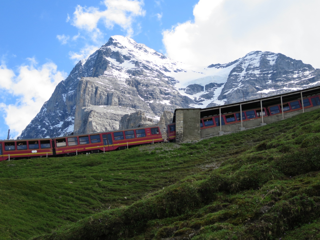 ハイキングの途中でアイガーをバックに山を登る登山電車が撮れました