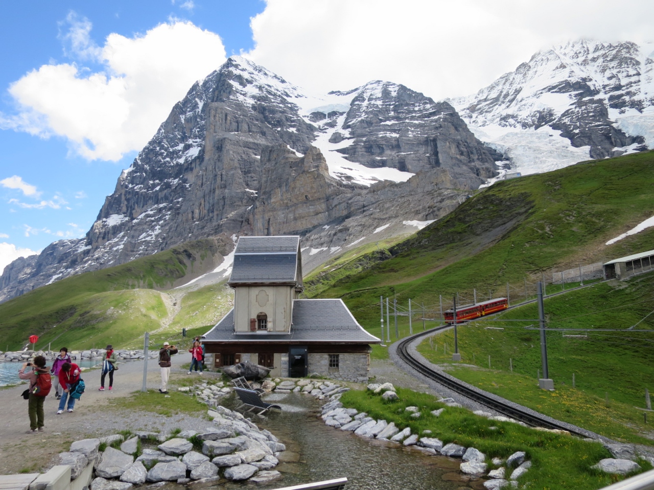H社のツアーでアイガーグレッチャー駅からクライネ・シャイデェク展望台まで一時間半ハイキングしました。色とりどりの高原植物が咲き誇る広々とした草原の中を下って行く気持ちの良いハイキングで、途中にアイガーをバックに山を登ってゆく登山電車が見える絶好の撮影ポインがありました。