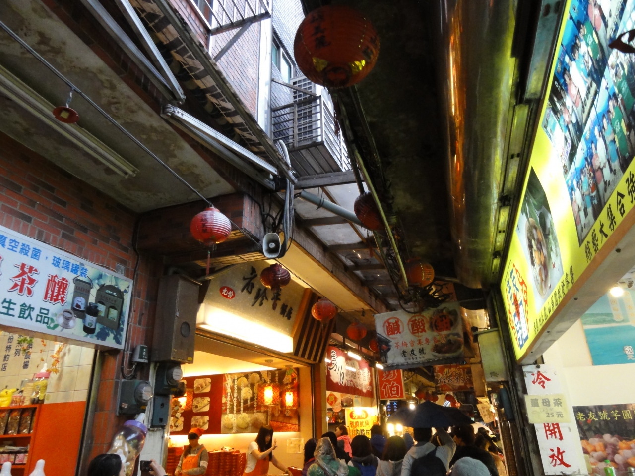 バス停を降りてセブンイレブンの横を入ると細い通りがあり、両側にお店がぎっしり並んでいます。これが基山街。いちおうアーケードになっていたので傘をささずにすみました。飲食店が多くて食べ歩きも出来ます。少ない量なら食べれるかなと思って竹串にささった臭豆腐に挑戦しました。臭いわりに食べやすくて美味しかったです。