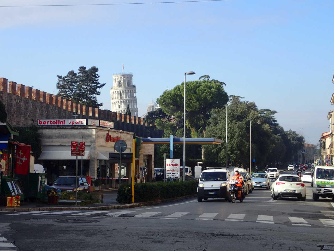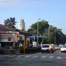 とりあえず傾いてるんやけど近くで見るより遠目から見てみて、今にも倒れそうに見えるで。俺が見たんは北東かな?塀が続いてるその外っ側で、塀が水平を保ってるからどんぐらい傾いてるかがわかりやすい。塔登んのはだいぶ並んでて動いてへんかったで。