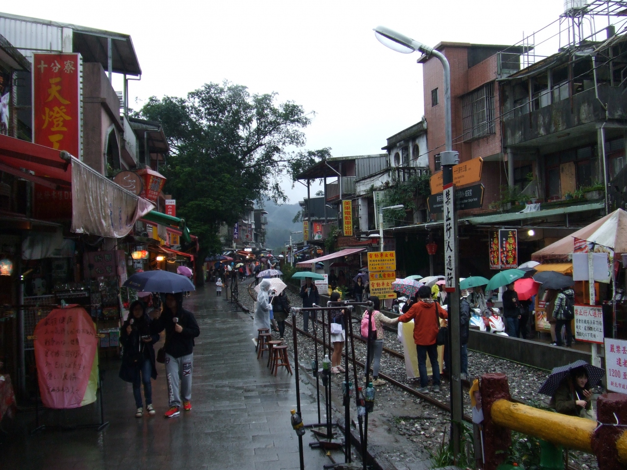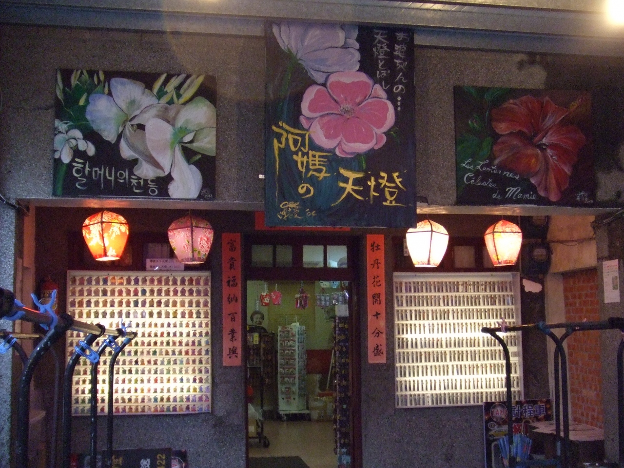平渓線で一番賑やかなのが十分老街。線路の脇に飲食店やお土産屋さんがたくさん並び、電車のいない時に線路で天燈上げをするのが有名な街。絶えず天燈が空に上がっています。天燈上げは一色のものが150元、複数色だと200元。お土産物屋さんには小さな可愛い天燈の飾りが50元位から売っていました。私は蓄光の茶色い天燈を90元で買ってきて部屋に飾ってあります。