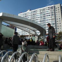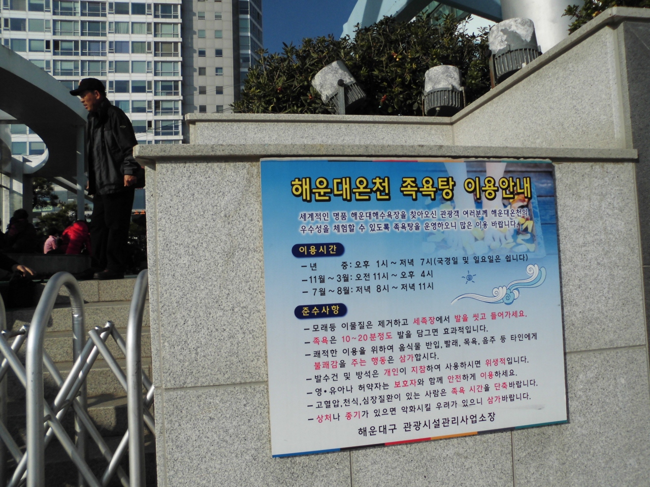 海雲台ビーチの観光案内所横にある80人同時に利用できる無料の露店足湯です。海雲台海岸から湧き出るラジウム温泉を足湯で体感できます。最初に靴と靴下をぬいで、足洗い用の液のたまりを通ってから奥にある足湯に浸かります。