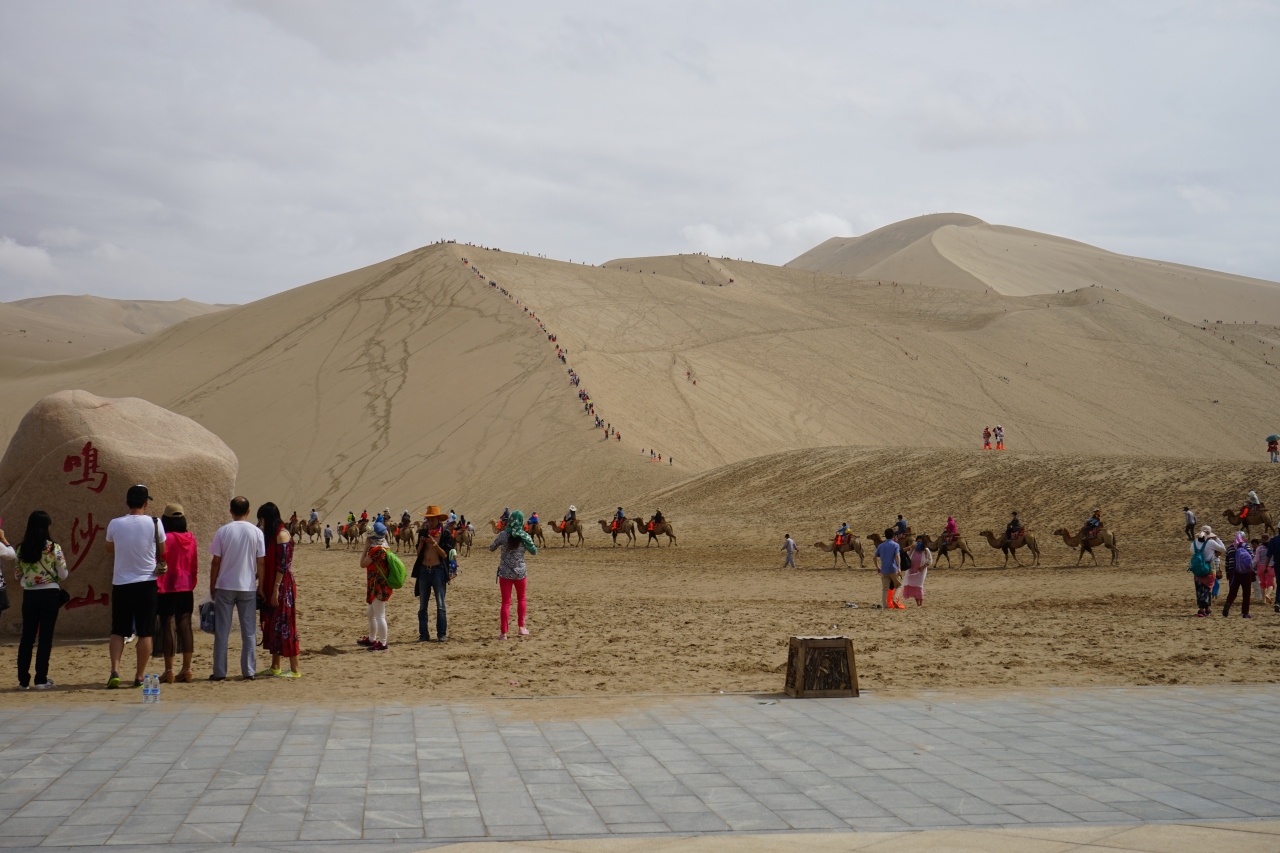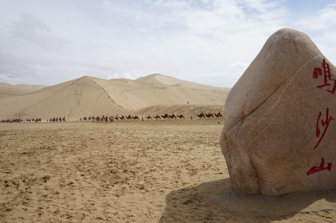 「シルクロード」というと月の砂漠を行く隊商を思い描いていましたが、実際はゴビ灘と呼ばれる石や砂利がごろごろした草木の生えない場所がオアシスとオアシスの間続いています。細かい砂でできた鳴沙山はまさしく私のイメージしていたシルクロードの風景でした。