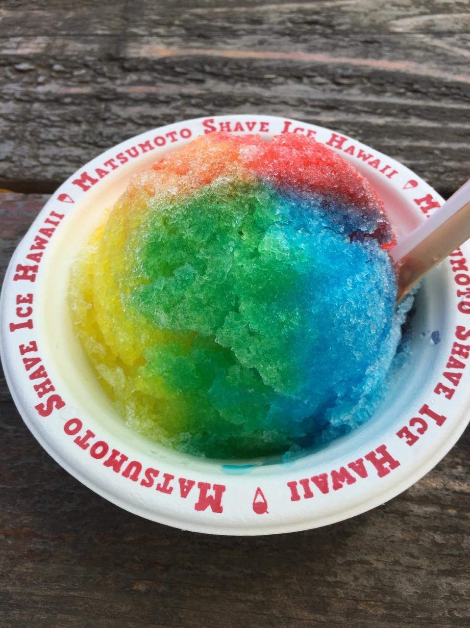 シェイブアイスのレインボーwithアイスクリームを食べました。レインボーは色々な味が楽しめるし、バニラアイスを加えることで飽きずに美味しくいただけますので、オススメです。
