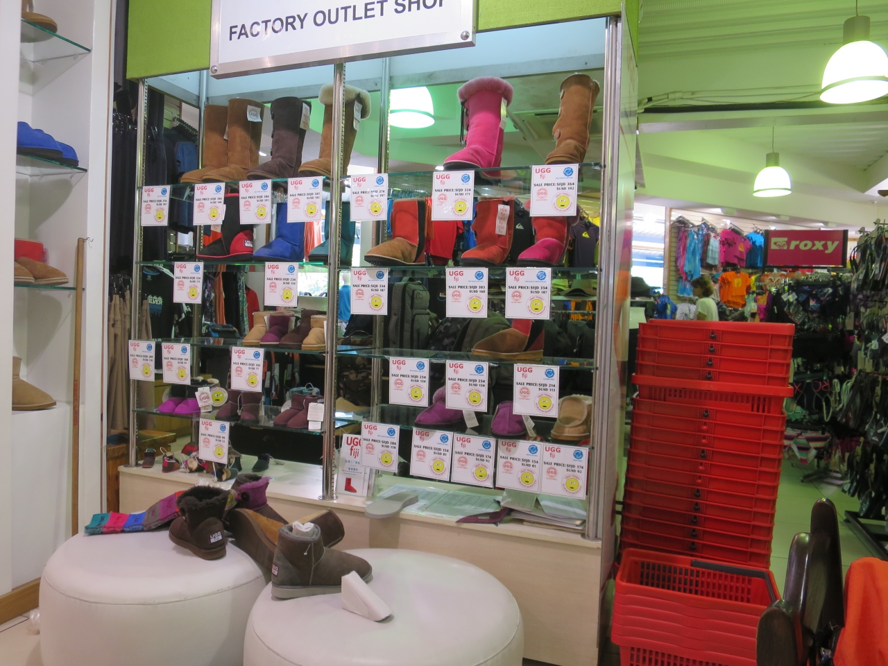 ポートデナラウ ショッピングセンターのなかの土産物店です。UGGブーツのオーダーに行きました。サイズや色の組み合わせなどを好みに合わせて作ってくれますが、サンプルの中間のサイズで受けられる、と言っていたのは本当かな、という出来上がりでした。注文した翌日にはホテルに届けてくれます。