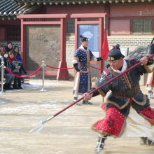 ソウルから地下鉄で水原駅へ移動、八達門へはタクシーを利用し、そして城内中央付近にあるここ「華城行宮」を散策です。ひと気も少なく撮影のセットのように簡単な建物のように見えます。入場無料です。ひと通り見回って帰ろうとすると、この中でもしっかりした正門の前でイベントをやっていました。剣などを用いた力強く戦い合っている演技しています。これを見ると韓国らしさが出てきますね。他にも「華虹門」、そこを流れる水原川は風情があるます。周遊する華城列車もあります。楽しんでくださいね。