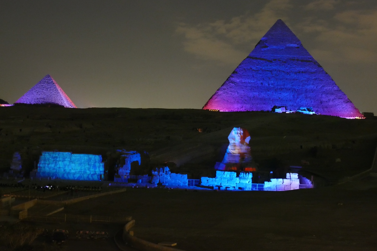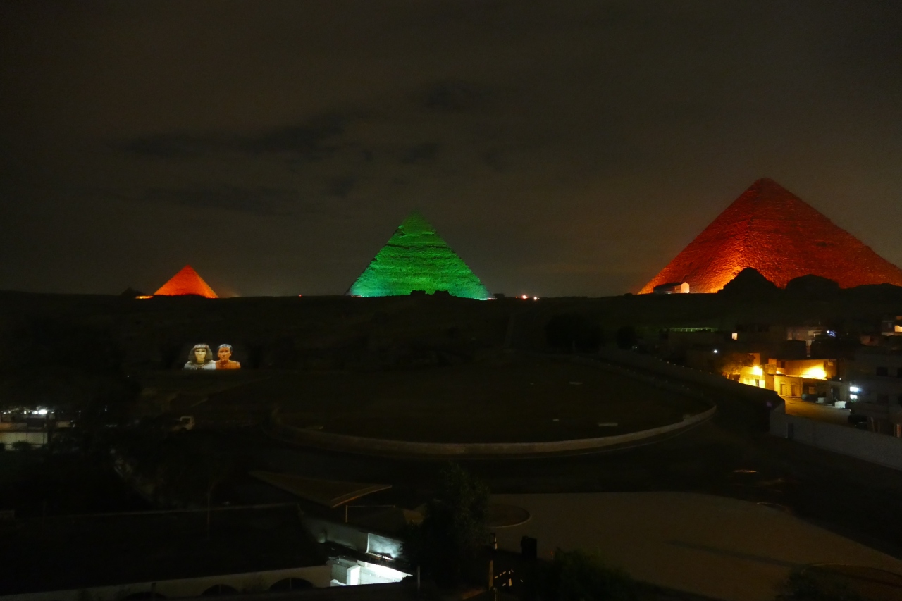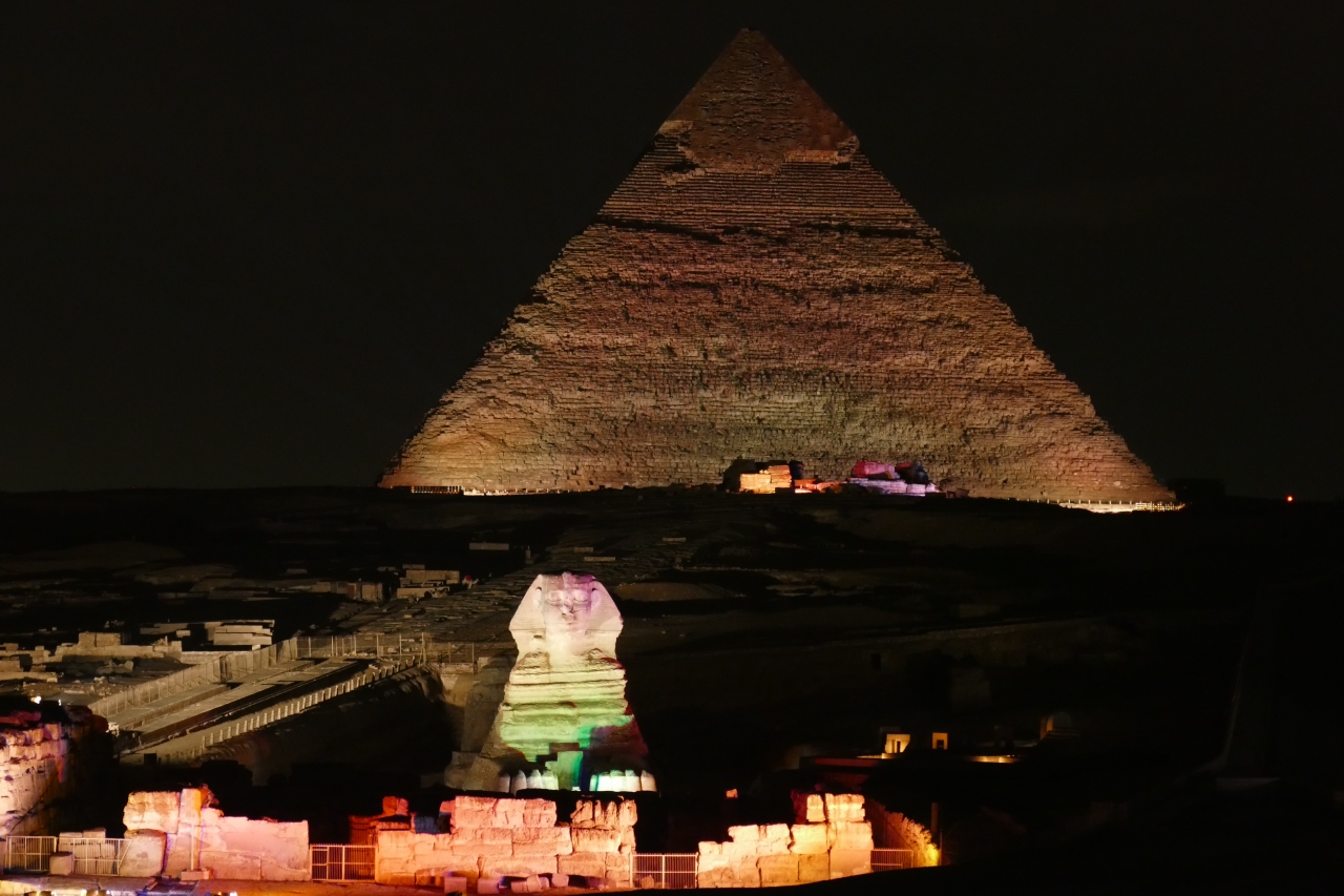 ギザのピラミッドの「音と光のショー」は、クフ王、カフラー王、メンカウラー王、スフィンクスが、サウンドやストーリーテラーとともにライトアップされる1時間のショーです(75LE)。