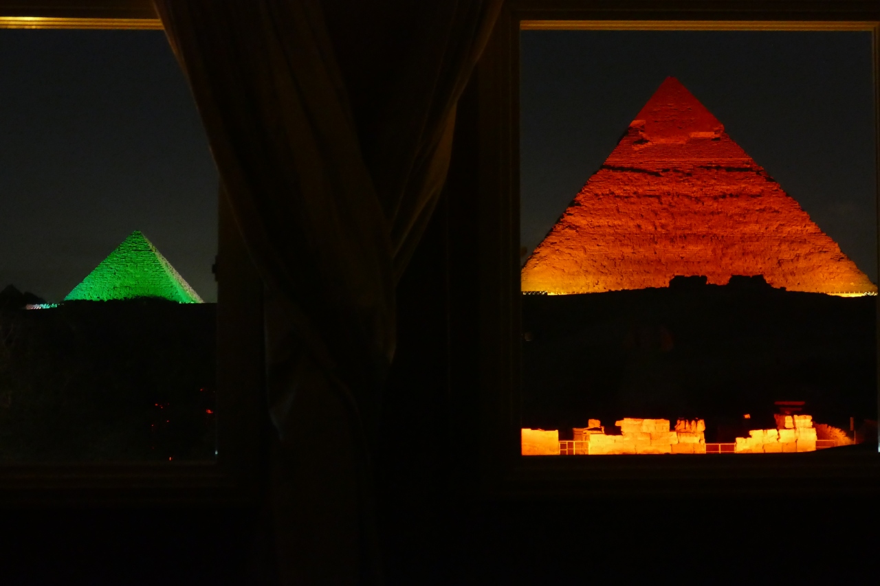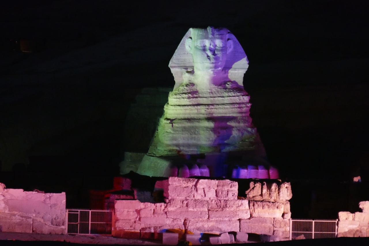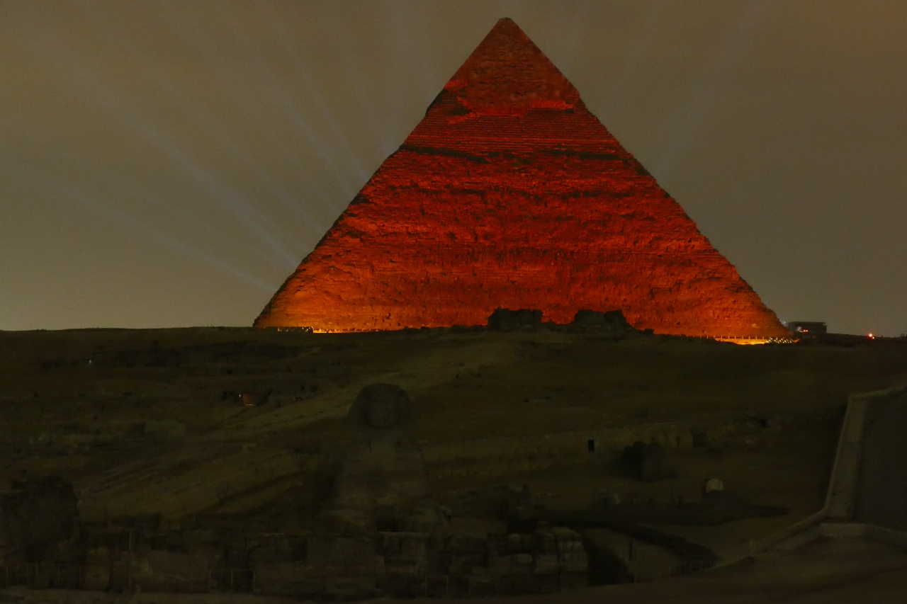 ギザのピラミッドの「音と光のショー」は、クフ王、カフラー王、メンカウラー王、スフィンクスが、サウンドやストーリーテラーとともにライトアップされる1時間のショーです(75LE)。