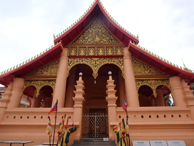 ヴィエンチャンの中心部にある寺で、けっこう規模が大きいです。本堂の壁はピンク色で、上の方には金色で仏像の模様の装飾がありました。ガイドブックには掲載されていませんでしたが、見学してみる価値はあると思います。
