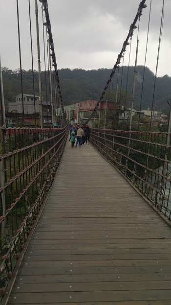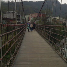 台湾国鉄の平渓線の十分駅のすぐ横に流れる基隆河に架かっている橋です。駅のホームからも見えるぐらいの近さで、駅の改札口からは少し遠回りしますが、徒歩2〜3分で橋のたもとに到達できます。川の両岸が切り立っているので水面から橋までも高いです。橋の両端の橋柱は鉄骨コンクリートのようなもので白色に塗装されており、掲げられている水色のプレートが鮮やかで目立っています。かなりしっかりとした吊り橋ですが、それなりに揺れます。橋の対岸は普通の住宅があるだけで観光スポットはありません。