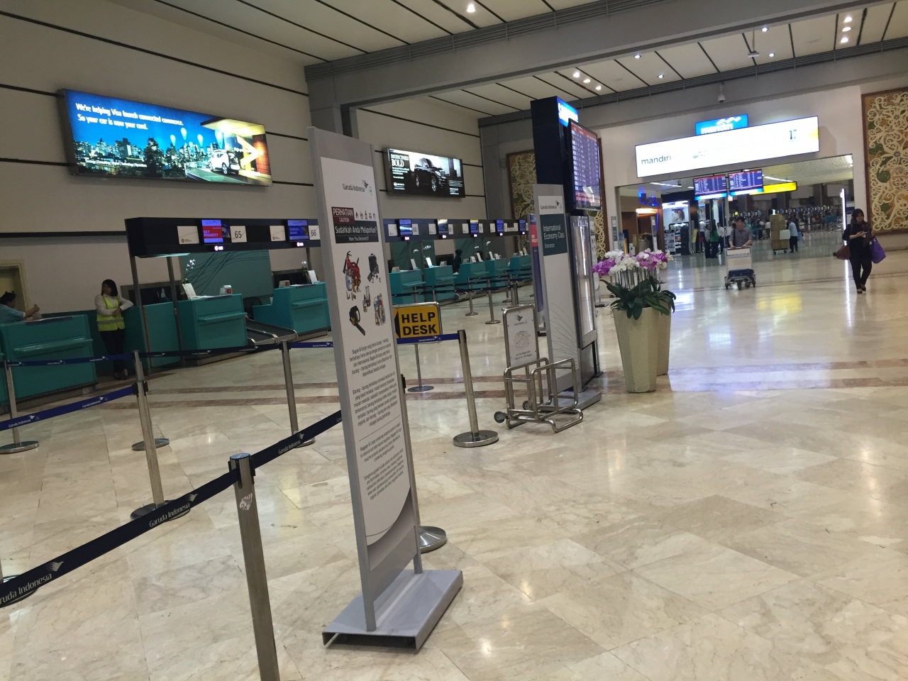私が利用したことのある国際空港は探さなくても両替所っていたるところにあったのにここは結構探しました。というか入国審査終わって到着フロアを出たところに3つまとまってあるだけ。とりあえずそこで両替したけどバリやスラバヤの空港よりめちゃくちゃレート悪かったです。国内線の出発フロアへ行くエレベーターや階段もちょっと分かりにくくて戸惑いました。レストランやおみやげ物屋さんはありますがそんなにそそられなかったかな。