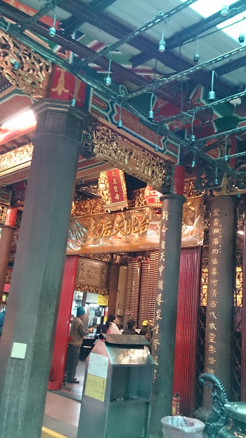台北有数の繁華街である西門町の一画にある廟で、飲食店や物販店が軒を連ねている中に混じって建っています。もちろんそうした中にあるのでちょっと浮いた感じで存在しています。道路に面した正面の間口は狭いですが、そこから奥に進むと意外に奥行きがあって広いです。台湾の寺廟らしくきらびやかな金の装飾や朱色に塗られた壁・柱で想像以上に明るい内部になっています。若者の街ですがミドル以上の参拝者が境内にたくさん居て熱心に願い事をしています。西門町を散策した際にちょっと立ち寄ると良いと思います。