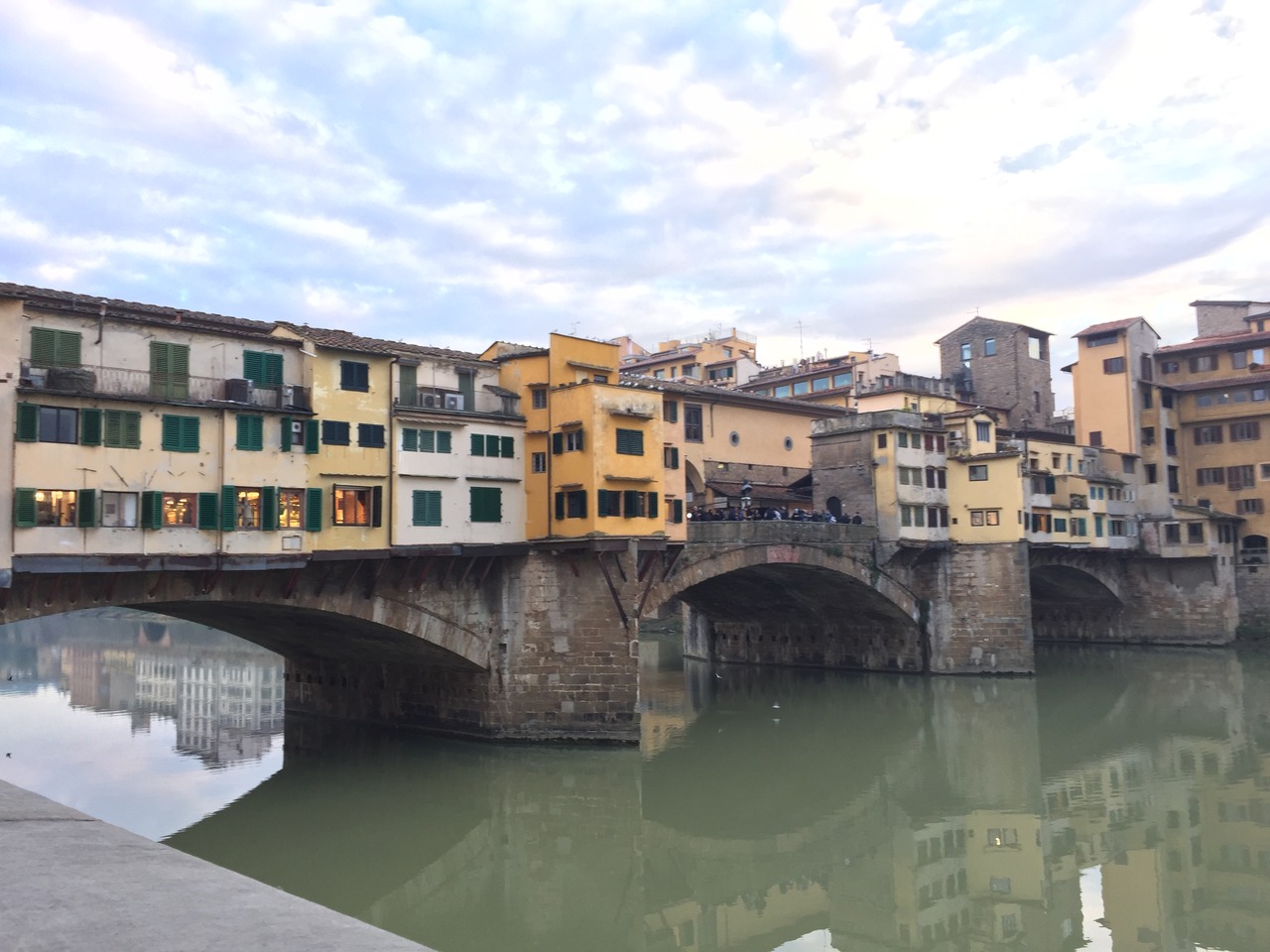 ウッシィツィ美術館の裏にあるヴェッキオ橋!たくさんの観光客で賑わっています。スリも多いし、自撮り棒を無理やり売りつけてくる人がいるので気をつけてください。ヴェッキオ橋の中には金製品のお店がたくさんあります。