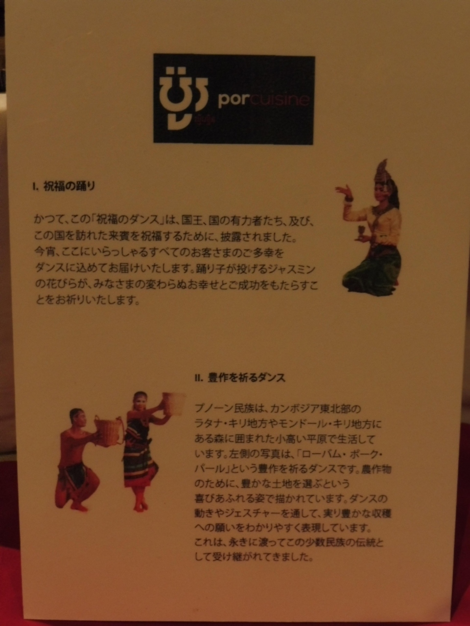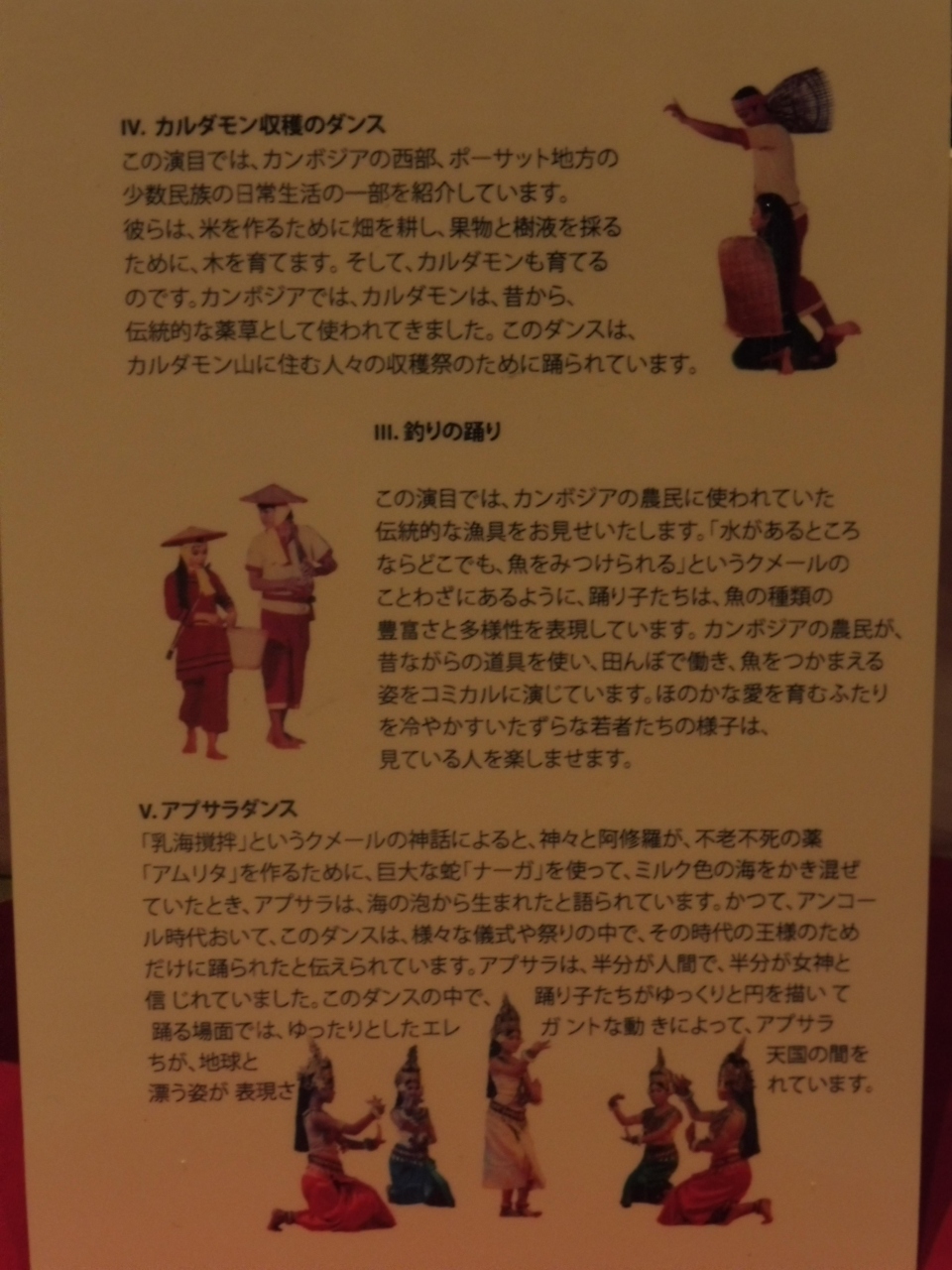 ダンスは5種類。最後にアプサラダンスでした。申し訳ありませんが、ダンスのレベルは判断出来ません。それほど大きくないので、ステージも良く見えて、雰囲気は十分味わえます。日本語のダンスの説明書がありました。