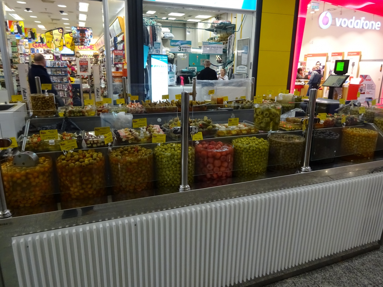 駅はショッピングモールと繋がっており、2階にはスーパーマケドニアや食事のできる店もあります。量売りでオリーブの酢漬けも売っていました。