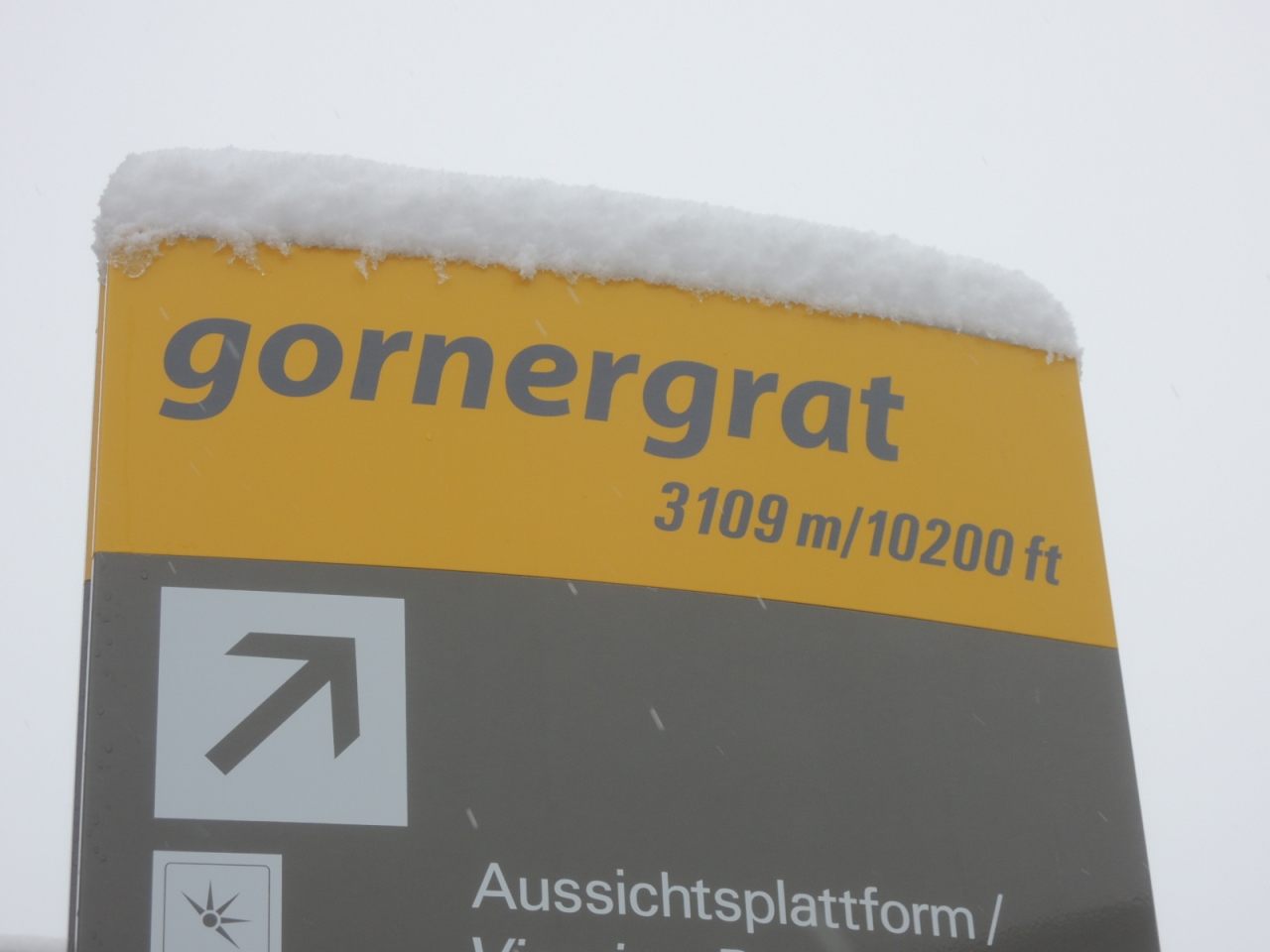 朝8時にツエルマットのホテルを出てゴルナグラート鉄道に乗って、9時ちょうどに終点のゴルナグラート展望台に到着しました。ツエルマットの街は晴れていましたが、ゴルナグラート展望台は銀世界になっていました。下界は晴れでいても3000m以上では10センチの雪です。当然マッターホルンは見れず、雪の帽子をかぶった看板を撮ってきました。時間にゆとりのある個人旅行であれば、ホテルや駅にある頂上のライブ映像で上の天気を確認してから出発すれば良いのでしょうが、日程が決まっている団体ツアーでは、大雪でも予定通り行かないといけません。