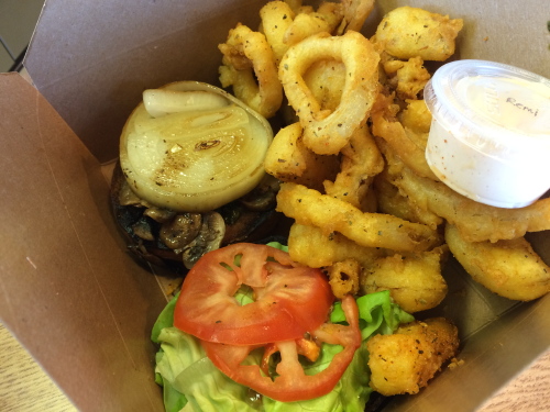 もう一つはベジーバーガー。グリルした玉ねぎとトマトレタスがサンドされていた。付け合せは衣がいっぱいのオニオンリングでした。