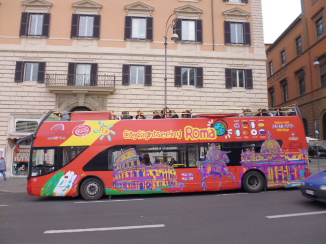 ローマのように大きな町で観光地が点在しているときに便利なのがこの2階建てオープンバスです。市内のだいたいの様子がこれで頭に入るし、ローマのように地下鉄が2路線しかないところでは重宝します。