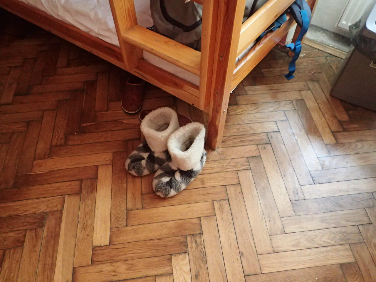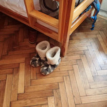 俺が行ったんはオペラ座の右横の筋を入って行ったとこ。おもに羽毛とかそっち系のふかふかしたちゃんちゃんことか室内履きの靴とかブランケットとか。値段交渉もできたけど、言い値で買ってもそんな高ないで。俺は150フリブニャで厚めの靴買った。