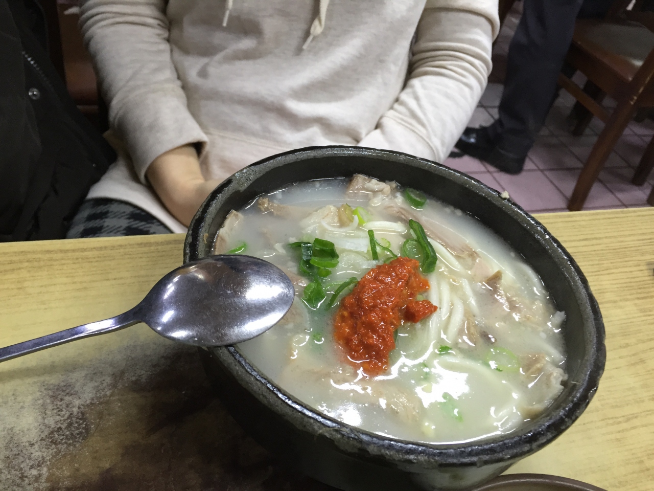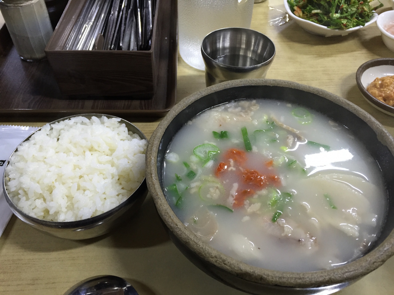 帰国日当日の朝に友人に連れて行ってもらいました。注文から2分ほどですべて揃いました。(私はご飯外付け、友人はうどんを注文しました)スープがとてもやさしい味でとても美味しかったです。途中、副菜についていたアミえびを入れて食べみました。アミえびの塩辛さがマッチしてさらに美味しくなりスープまで完食してしまいました。