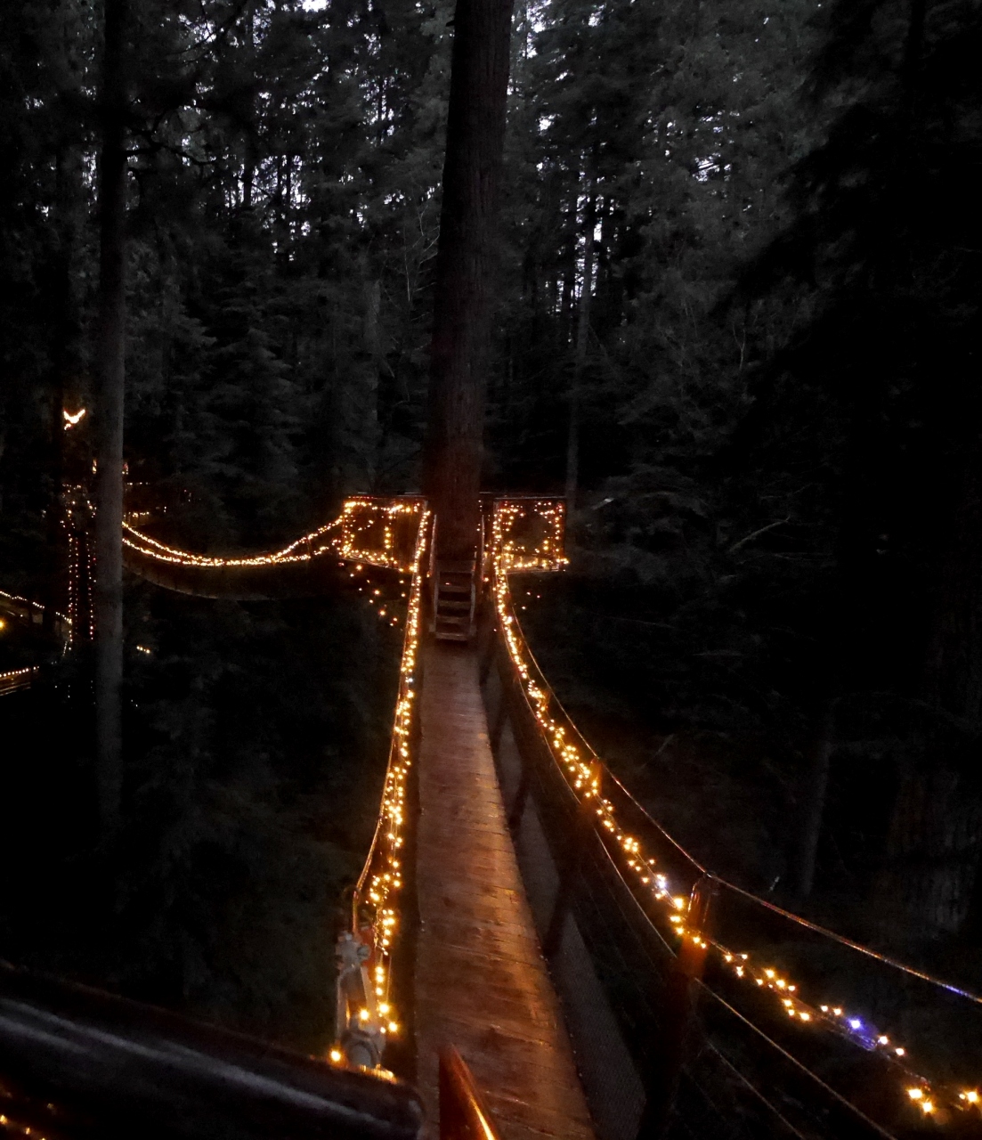Lonsdale Quay Terminal経由で236番のバスでCapilano Suspension Bridgeに.実は雨で外が見えず,運転手には行き先を言ってあるはずだが,注意してくれずそのまま,偶然乗り合わせた,もう一人の日本人の女性と乗り過ごしてしまう.終点のGrouse Mountainで折り返す羽目になった.入場料37.95CADとバカ高い.まあ木の上に登ったり断崖の中断を歩いたりできるのでしかたないか.自然のすごさをエンターテイメントにした施設だ.雨の冬の日に行ったが,ライトアップはそれなりに良かった.