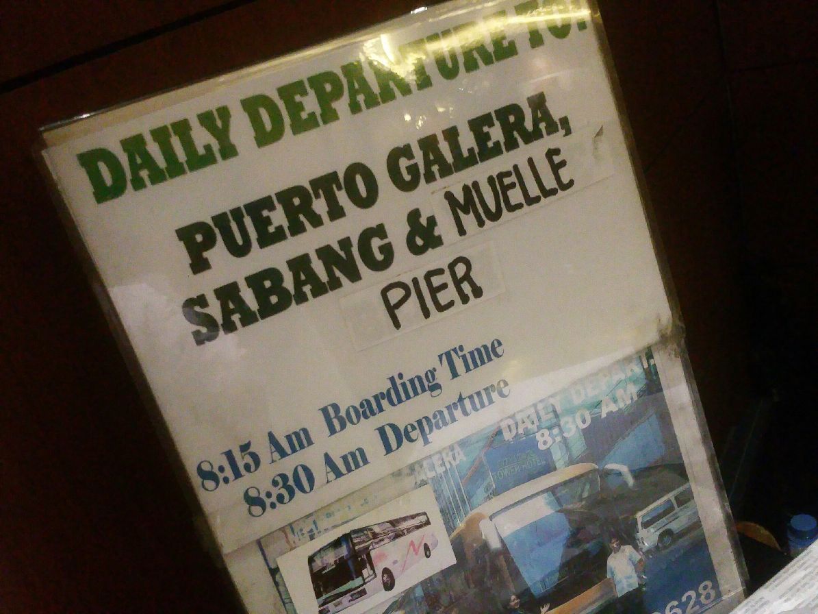 マニラを朝8時出発だったが、当日行ってみると8時30分に変更されていた。(逆だったら乗れなかった)理由は途中の道の混雑が解消されて早くバガンダス港に到着するとのことでした。プエルトガレラからの帰りはマカティ地区もしくは空港行きの方は途中下車できます。13時頃到着ですので15時以降の飛行機なら間に合いそうです