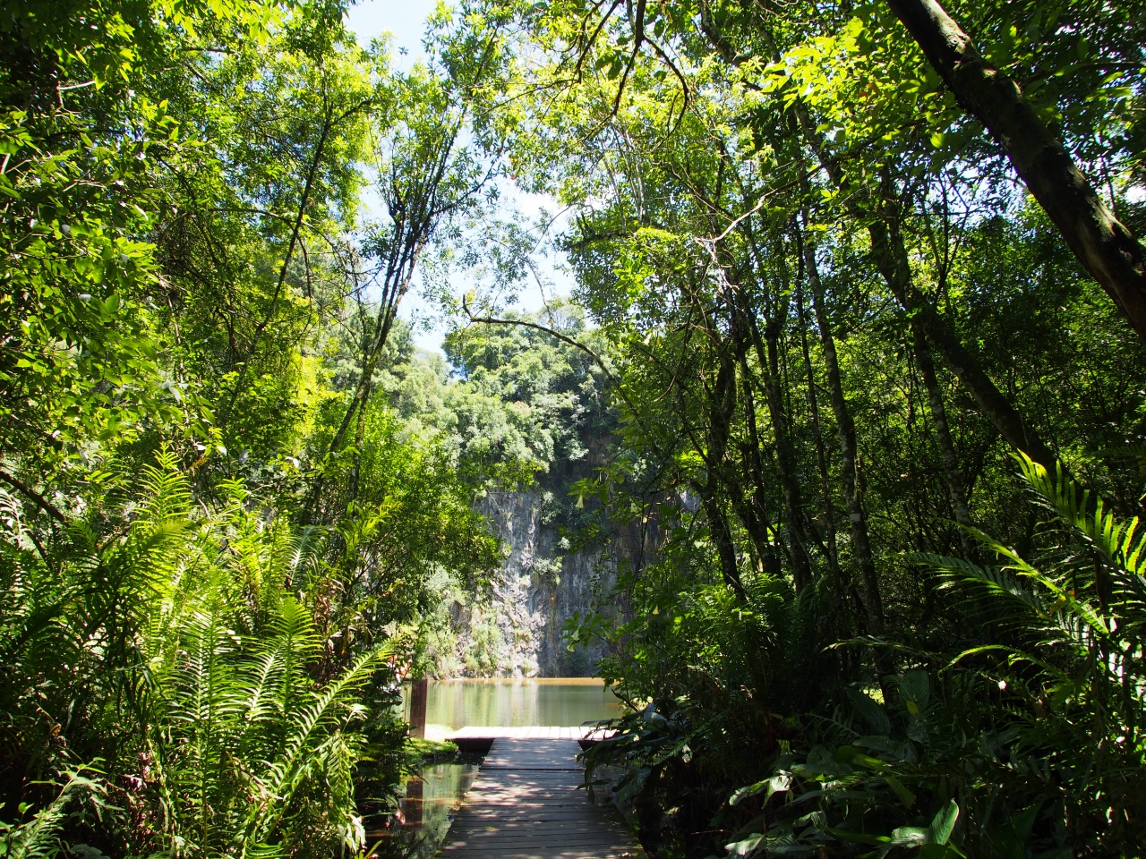と、いきなり、湖畔(池)と それを取り囲む4−50mはあろうかという絶壁が目の前に現れます。この景色が、実に豪快で、目が釘づけ.....思わず出る言葉が「おおおおおっっっ....」.......心が奪われてしまいます。