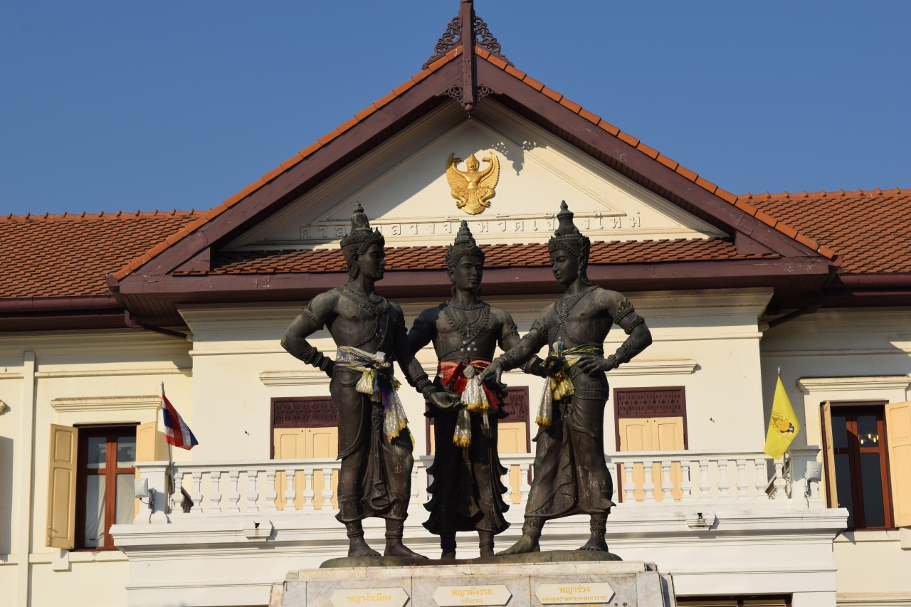 チェンマイ旧市街地 チェンマイ市芸術文化センター前(旧県庁前)に3人の王像がある。