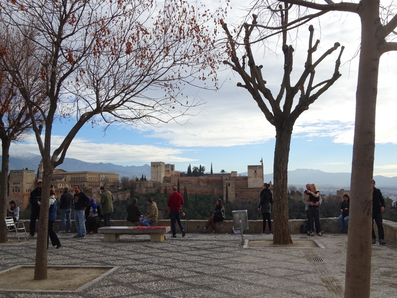 この眺めはアルハンブラ宮殿の写真でもポピュラーですが、実物は感動ものです。広場では地元のひとの憩いの場所でもあるようでした。