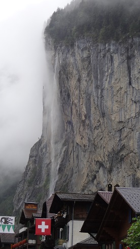 ユングフラウ地方で最も有名な滝の一です。ラウターブルンネン駅の近くの滝で、ホームからも見ることができます。歩いて近くへ行くこともできます。切り立った崖の上から谷底に向かって落差300mを流れ落ちています。崖の上から空中に飛び出た水は途中から風に煽られ、霧のようになって落ちていました。