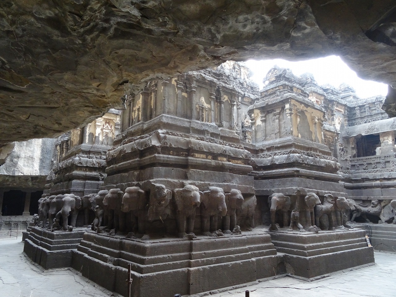 ★カイラーサナータ寺院 基礎部には、「宇宙を支えるゾウ」の群が並びます。ここがシヴァ神をまつる住まいであるとともに、全宇宙でもあることを示しています。ここは、時間とか、費用とか、労力とか・・・そういった計算をすべて度外視した世界観から創造されたのだろうな、と、異質の空気が流れています。