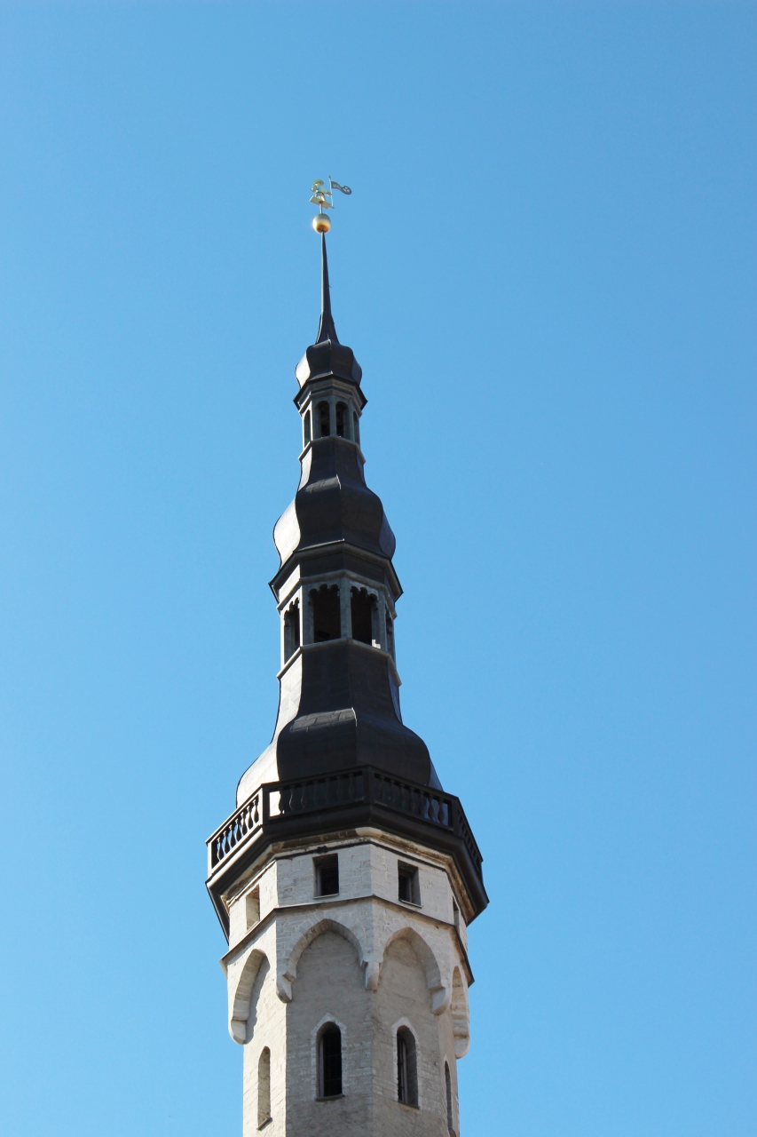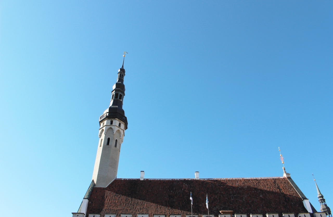 尖塔の多いタリン旧市街ですが、旧市庁舎の塔は65mという高さの他、塔の上にある風見鶏「トーマスおじいさん」でも目立っています。この風見鶏はタリンのシンボルとなっていて、第二次世界大戦の時にはソ連軍の攻撃も受けたそうです。塔の上にいるのは2代目ですが、旗をしっかり持っています。