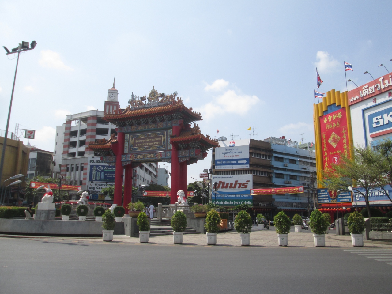 約1年半ぶりに中華門に訪問しました。ちょうど、旧正月のシーズンに訪問しましたが、ヤオワラート通りには赤色の垂れ幕があり、門の両脇にいる白い獅子二頭と白うさぎに赤い布が巻かれており、旧正月モードになっていました。