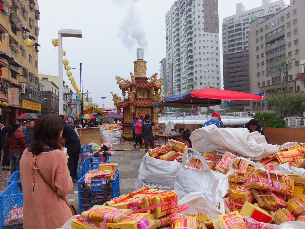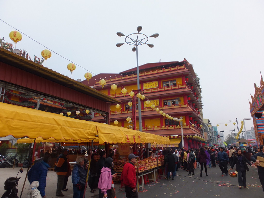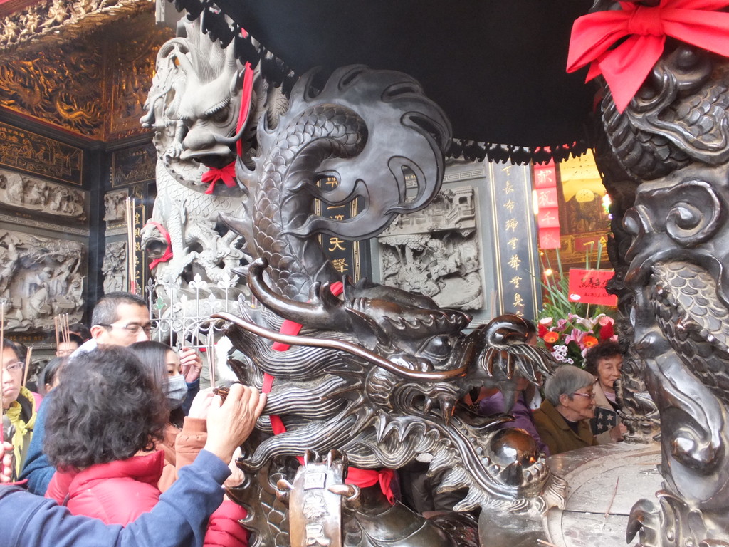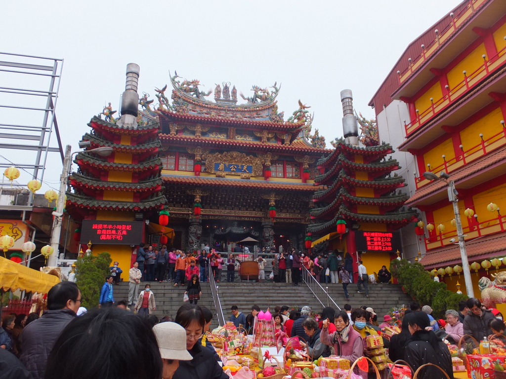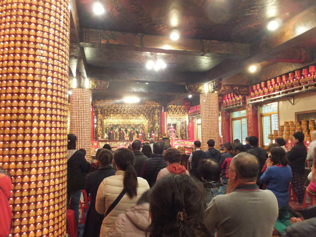妻と友人と高雄天公廟へお参りにきました。高雄天公廟には玉皇上帝(或いは玉皇/玉帝/天公)が祀られており、道教では最高の神です。庶民から深く崇拝されており、願い事をかなえてくれるということでパワースポットして人気があります。天公廟はここの他にも、台湾各地にあります。今日は、春節、旧暦の最初の9の日、神様の誕生日と言うことで、商売繁盛を願う市民が多く参拝していました。普段は余り混雑しないと思いますが、特別な日なので混んでいました。