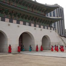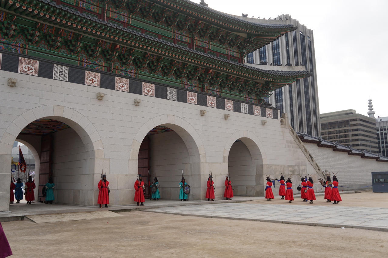 光化門は、1394年、李氏朝鮮の創始者で初代の国王であった李成桂が高麗の王都だった開城からソウルに遷都した際に、景福宮の正門として建てられたもの。もちろん、現在の門は復元されたもので、鉄筋コンクリート製です。