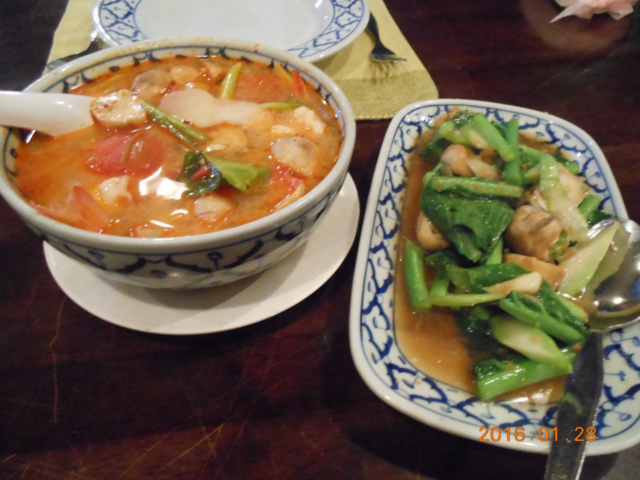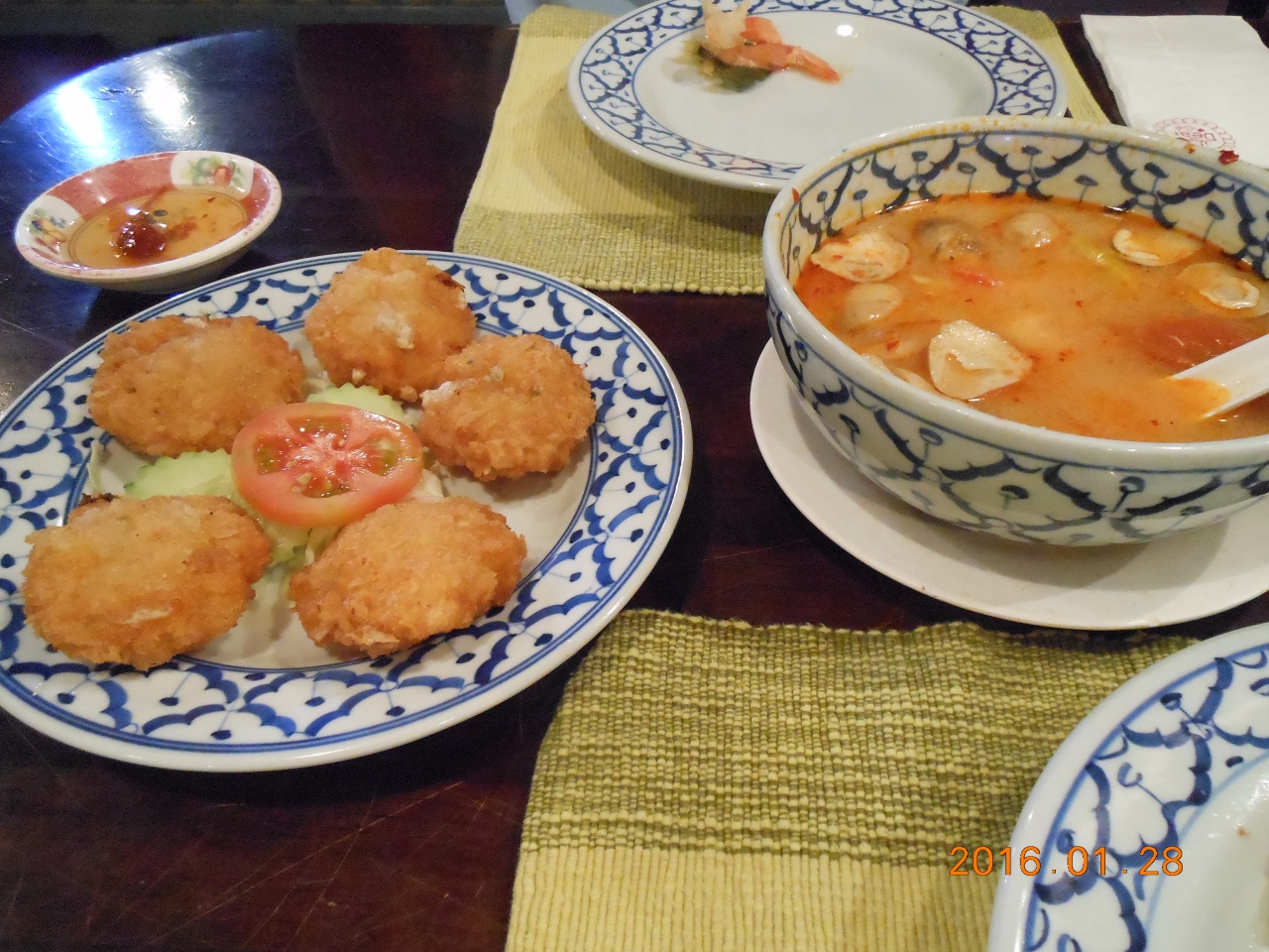 トムヤンクン、エビのすり身揚げ、野菜いため、デザート3種をいただきました。美味しかったですが、トムヤンクンに入っていた硬い葉っぱだけは食べれませんでした。デザートのカボチャスイーツはお代わりしたかったですが、二人ではこれ以上無理で残念でした。4人ぐらいで来るといいなぁと思いました。しめて825バーツでした。