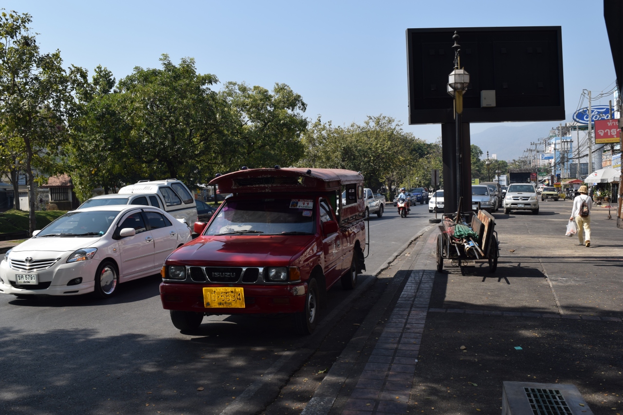 旧市街地からチャーンプアック門前の広場を通り抜け横断歩道を渡ると左手に、ワット・ドイ・ステープ行の赤色のソンテオが停車しています。