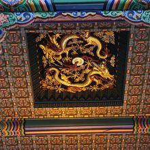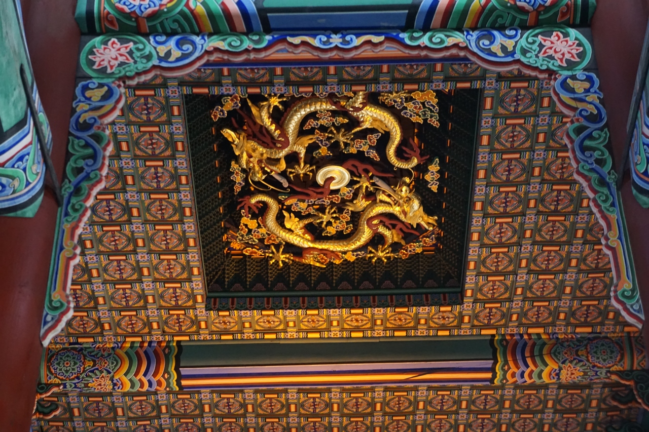 奥の柱の中央には王座があって、その後ろには日月五岳図。天井には、足指の爪を7つ持つ対の七爪龍があって、見所ですが建物の左横から見ないと見えにくいので、ご注意を。