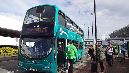 ダブリン・バス社の運行する空港バス、Airlink747番が、市内中心部のオコンネル・Stと空港を結んでいます。グリーンの二階バスです。所要時間40分で、空港からは6:00~23:30出発。片道6ユーロ、往復10ユーロです。乗り場は、空港出口を出てすぐです。一方、エア・コーチ社の運行する空港バスは、24時間運行しています。片道7ユーロです。