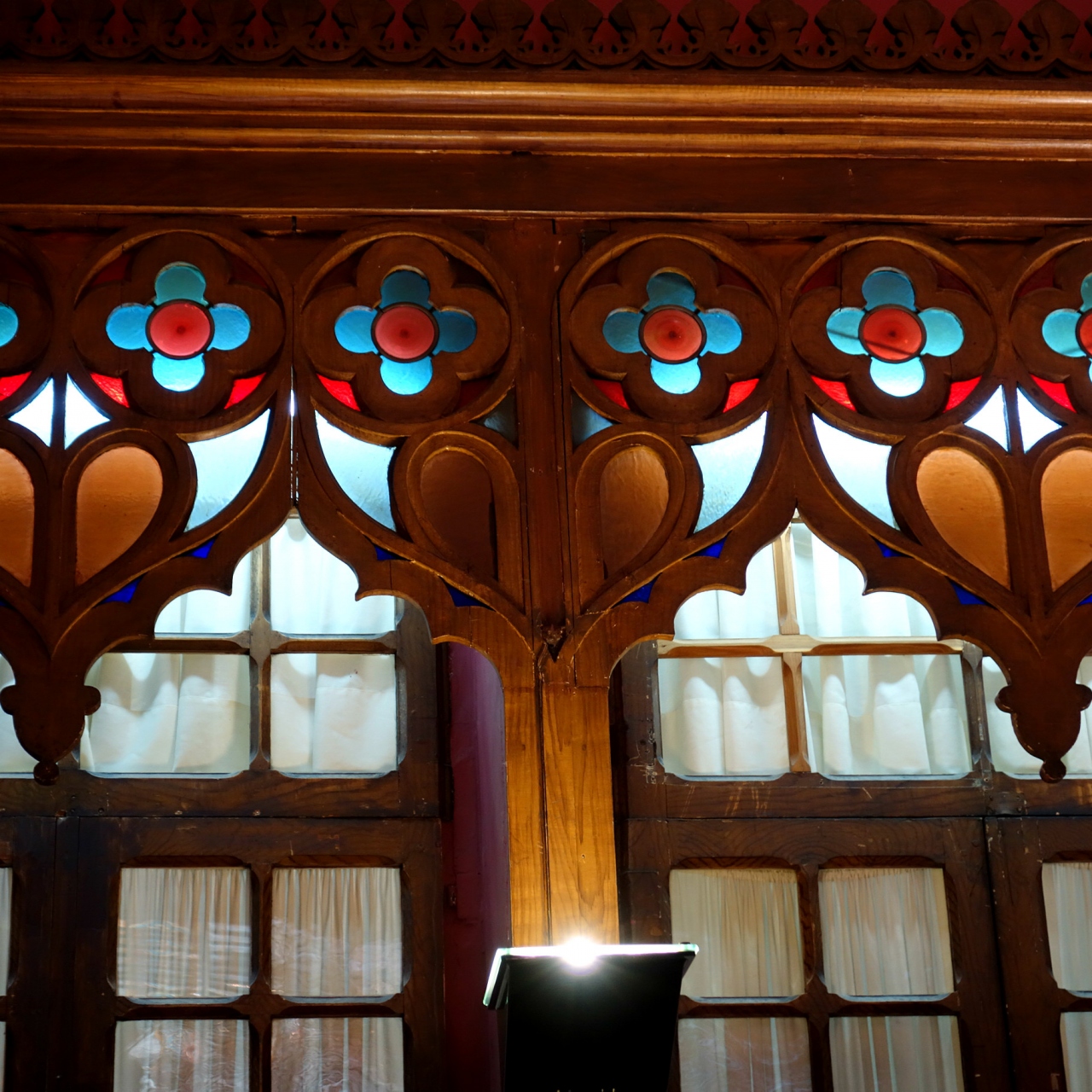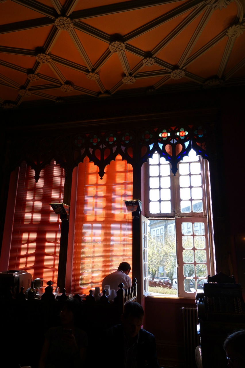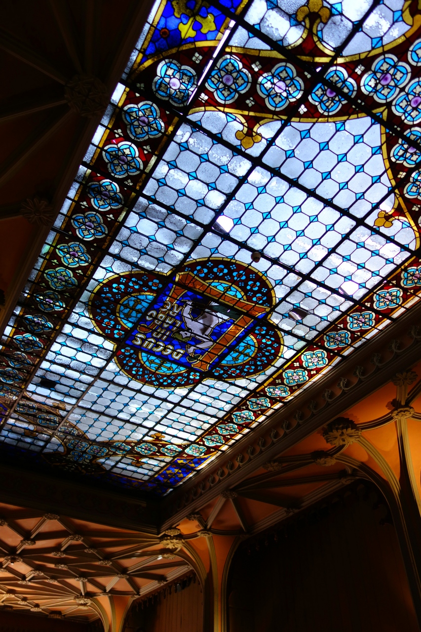 2階天井の美しいステンドグラスに圧倒される。2階にはカフェもあり。