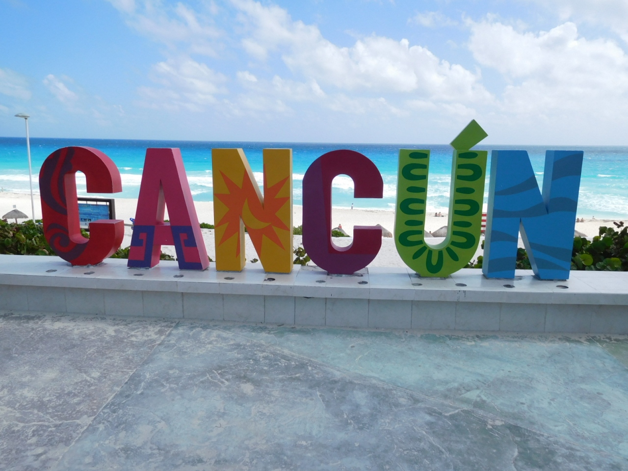 カリブ海に面した「CANCUN」文字のカラフルなモニュメント。