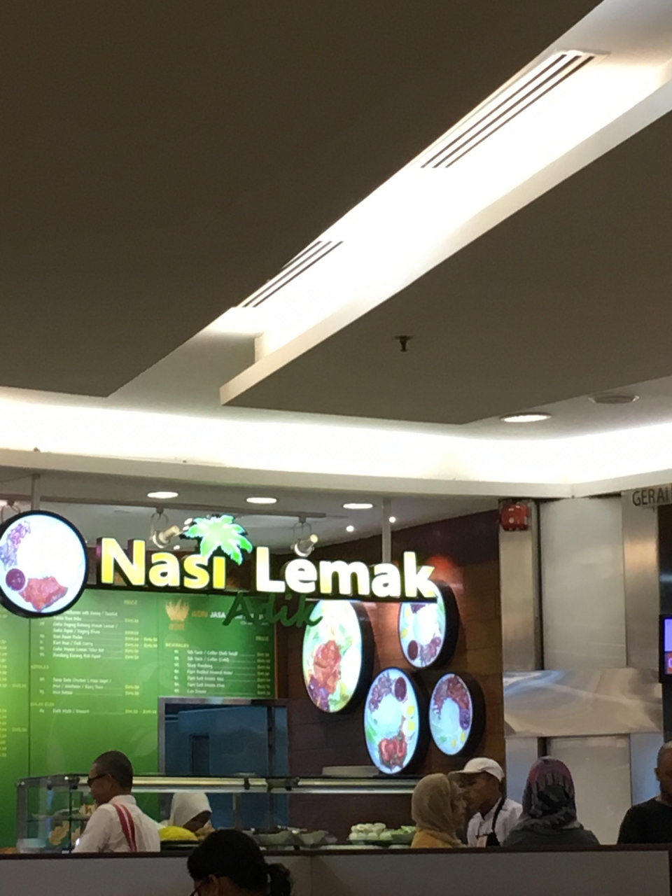 ラクサやカレー、フルーツジューススタンド、ケーキなどのデザートなどいろいろなお店が入っているフードコートです。ナシレマのお店があったのでランチしました。ココナッツで炊かれたご飯はとても香りがよくて塩辛いおかずと一緒に食べるととてもおいしかったです。
