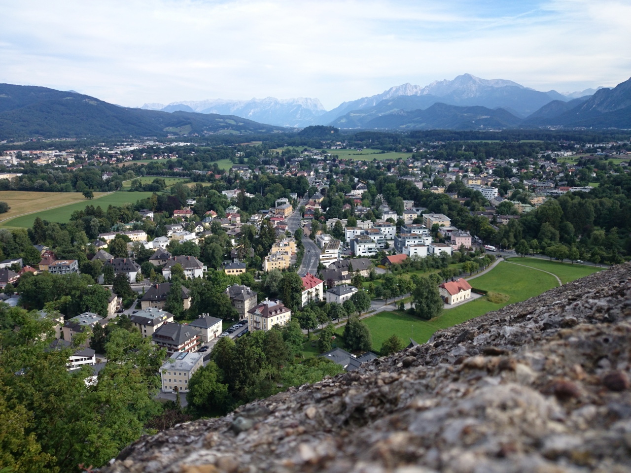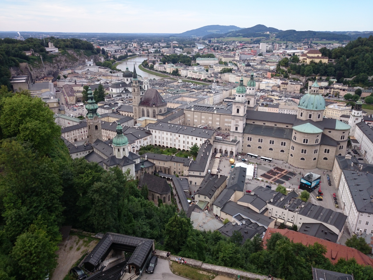オーストリアを旅行するなら、是非、夏のザルツブルクに来てみて下さい。ザルツブルク音楽祭で混んでいるかな?と心配しましたが、多少賑やかな程度で、日本の夏の観光地に比べれば、空いていて快適、快適!その中でも、一番のおすすめが、ここ、ホーエンザルツブルク城塞。歩いても20分、ケーブルなら5分。歩く場合、急なところはありませんが、さすがにハイヒールやかかとのないサンダル履きの方はちょっと大変でした。できれば、スニーカーが一番。また、歩く場合、登り口はケーブルカー脇の口が一番、楽だと思います(他にもありますが)。そうして頂上の広い広場からの眺めは、とにかく、絶景です。絵になります。遠景に山あり緑ありうねった川(ザルツァハ川)あり、旧市街のヨーロッパの街並みが一望に見渡せ、こんな素晴らしい景色、日本にもあったらいいな・・、と感動。また、カフェが2か所あるので、そこで飲むビールが最高!時間の過ぎるのを忘れてしまいます。ただし、蜂が多いのには閉口しました。刺さないので、大丈夫と思いますが、要注意です。治安も良く、スリには気を付けていましたが、あまり小汚い身なりの人は見かけず、スマホで写真撮っても、ひったくられるようなことはなく、安心して過ごせました。西洋の方が多かったですが、アジア系、特に中国と思われる方々も大勢来ています。でも、日本人はほとんど、見かけなかったですね。そもそもザルツブルクの町に、日本人の姿はほとんどありません。そういう意味では、折角海外旅行に来たのに、着いたら日本人ばかり、と興ざめすることはなく、非常に良かったです。音楽祭のシーズンにも関わらず、ですよ。ちなみに、その日に泊まった宿は、サウンド・オブ・ミュージックの舞台となったレオポルツクロン宮殿!部屋から湖が一望できる、本館に泊まりました。夕焼けが湖を照らす風景は一生ものでした。但し、宮殿をホテルに改装したので、ディナーレストランはないので、外で食べましたが、近くに良い店を紹介してくれるので、不便はありませんでしたよ。でも朝食はホテルで食べることができ、特にテラスから湖を眺めながらの食事は感激もの!!日本でこのレベルの宿に泊まれば、1泊5~6万円(宿泊のみ、2名)はするでしょうが、ここは、3万円台。280ユーロ(オンシーズン料金で)。ここにも、宿泊客に日本人の方の姿は見えませんでした。ザルツブルクまで来たら、ここがおすすめ。本当は、穴場として、あまり紹介したくないのですがね。(笑)。