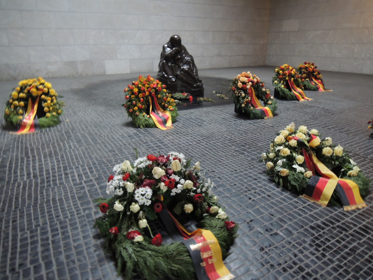 ノイエヴァッヘはかつての衛兵所で、現在は「ファシズムと軍国主義の犠牲者慰霊館」として利用されており、毎年5月8日の終戦記念日に政府の首脳陣が献花するのが恒例だそうです。ひっそりとした館内中央には、コルヴィッツの「戦死した息子を抱く母親」と言う作品を拡大したレプリカがぽつんと置かれ、静かに平和を訴えかけていました。像の周りに置かれた幾つもの花輪が印象に残りました。