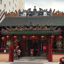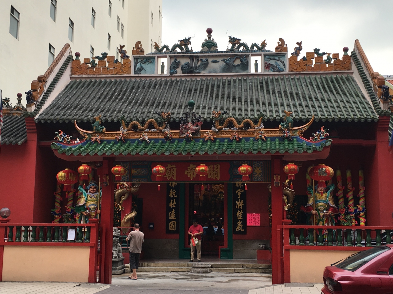 チャイナタウンのスリ マハ マリアマン寺院の向かいくらいにある寺院です。スリ マハ マリアマン寺院が地味なのに対してこちらは赤の柱に天井ととても色鮮やかなお寺です。中はお線香がたくさんたかれていて煙でいっぱいでした。