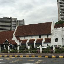 ムルデガスクエア芝生が終わるところの道路を挟んで向かい合って建っている白と茶色のコントラストが美しい教会です。とてもかわいらしい雰囲気で横長の作りになっていて周りを策に囲まれていて建物の中には入ることができませんでした。