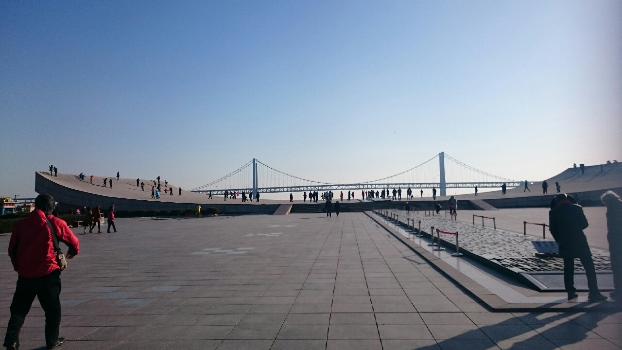 天安門広場よりも大きな広場ということで有名のようです。ここから海を眺めることもできるし、小さな遊園地もあります。最近有名人の足跡のモニュメントができたようで、どんと真ん中にありますが、そこを踏む人もいて、監視員に怒られていました。