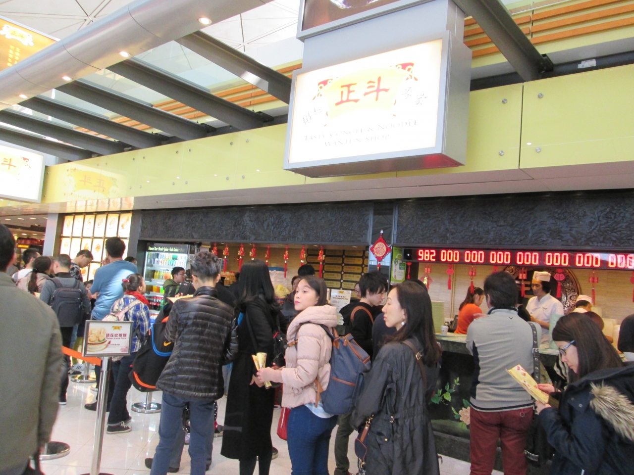 香港国際空港第一ターミナルのフードコートにあります。いつも注文のコーナーは長い列だし、空席を見つけるのは困難そうなので諦めていたけれど、今回どこも混んでいてピザ店など待ち時間40分といわれて仕方ないのでフードコートへ。