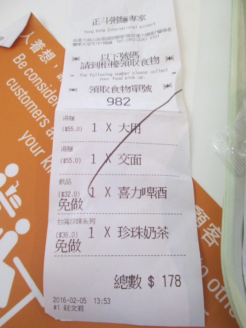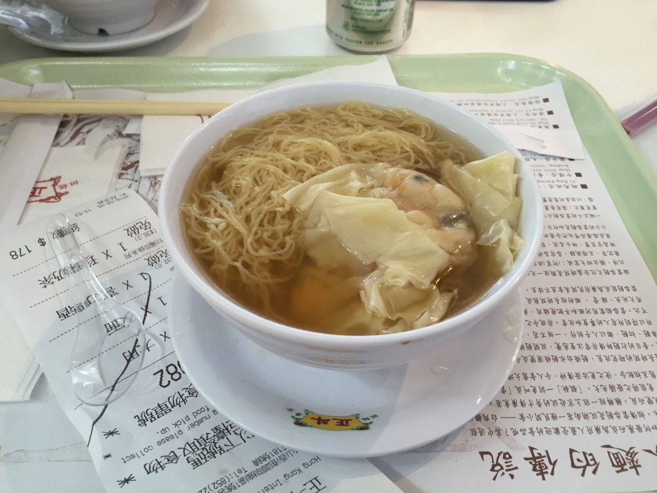 カウンター横にメニューが置いてあったので、並んでいる間に注文するものを決め、指さしで注文OK。待っている間に主人が空席確保。注文カウンター手前の冷蔵庫から飲み物を選び一緒に会計。普通のエビワンタン麺とエビ蒸し餃子入りとビールとタピオカミルクティーで178HK$。会計後レシートをもって待っていると意外にもすぐ出来上がります。